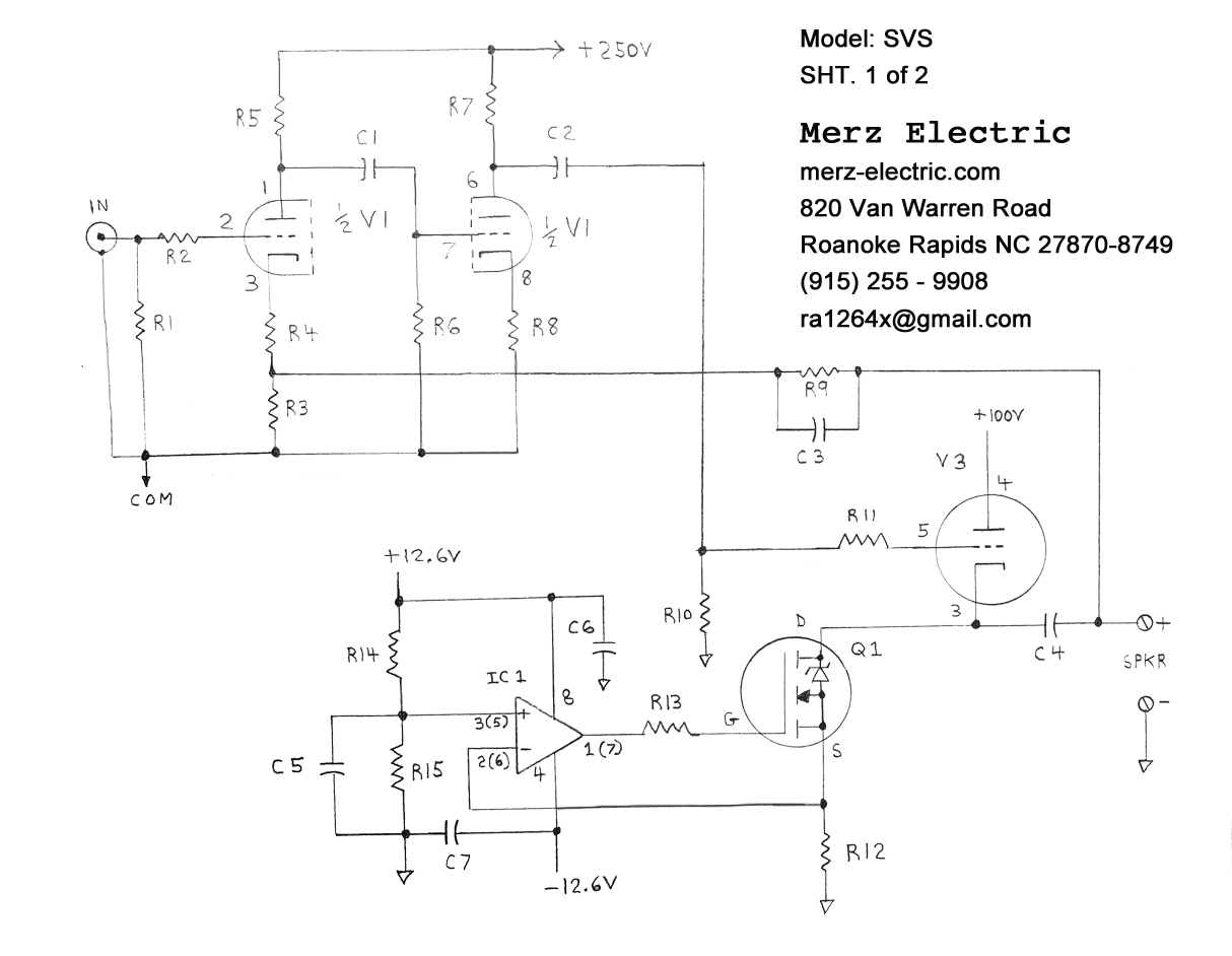 Circuit Description (schematic sht. 1, one channel shown) The signal input is direct coupled to a conventional, two stage voltage amplifier V1 (tube type: 12AU7, 5814, 6189) The amplified signal is capacitively coupled to the grid of V2, a 6C33C-B high power, dual triode vacuum tube. The cathode of V2 is sourced from a 750 ma current regulator utilizing an N channel MOSFET Q1 (Exicon ECF10N20) The current regulator 750 mv reference is from voltage divider R14 and R15, this voltage is then matched with the current feedback voltage across R12. Operational amplifier, IC1 (type TL082) regulates the current via a signal to the gate of MOSFET Q1. The amplified signal at the cathode of V2 is developed across the Q1 current regulator and coupled through C4 to the speaker. A negative feedback signal from the speaker is fed back to the cathode of V1 via R9 and C3.